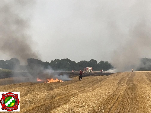 PM Wippingen. Gegen 18.37 Uhr am Donnerstagabend wurde die Feuerwehr Kluse zu einem Kornfeldbrand in die Ortschaft Wippingen gerufen. Bereits von weitem war eine enorme Rauchentwicklung sichtbar, sodass bereits auf der Anfahrt zur Einsatzstelle die Feuerwehr Dörpen nachalarmiert wurde. Bei Eintreffen der Feuerwehr stand ein rund zwei Hektar großes Stoppelfeld in Brand. Der Landwirt konnte seine Ernte- und Arbeitsmaschinen noch rechtzeitig aus dem Gefahrenbereich entfernen, sodass hier kein Schaden entstand. Das Feuer breitete sich schnell aus und drohte auf ein angrenzendes Waldstück überzugreifen. Mit massiven Wassereinsatz der Feuerwehren konnte ein Übergreifen verhindert werden. Ein ortsansässiges Lohnunternehmen, welches für die Feuerwehren gereinigte Güllebehälter mit Wasser vorhielt, wurde zur Unterstützung angefordert. Dieses habe sich bereits im letzten trockenen Sommer bewährt. Gerade an Einsatzstellen wo Löschwasser nur über große Entfernung zu erreichen ist, dienen diese Behälter als eine sehr gute Unterstützung der Einsatzkräfte. Da der Einsatzort an der Grenze zum Schießgebiet der WTD91 liegt, wurden seitens der Leitstelle ebenfalls zwei Tanklöschfahrzeuge der Bundeswehr-Feuerwehr zur Unterstützung angefordert. Diese brauchte aber nicht mehr eingreifen. Im Einsatz waren die Feuerwehren Kluse, Dörpen und der WTD91 mit neun Fahrzeugen und 48 Einsatzkräften.