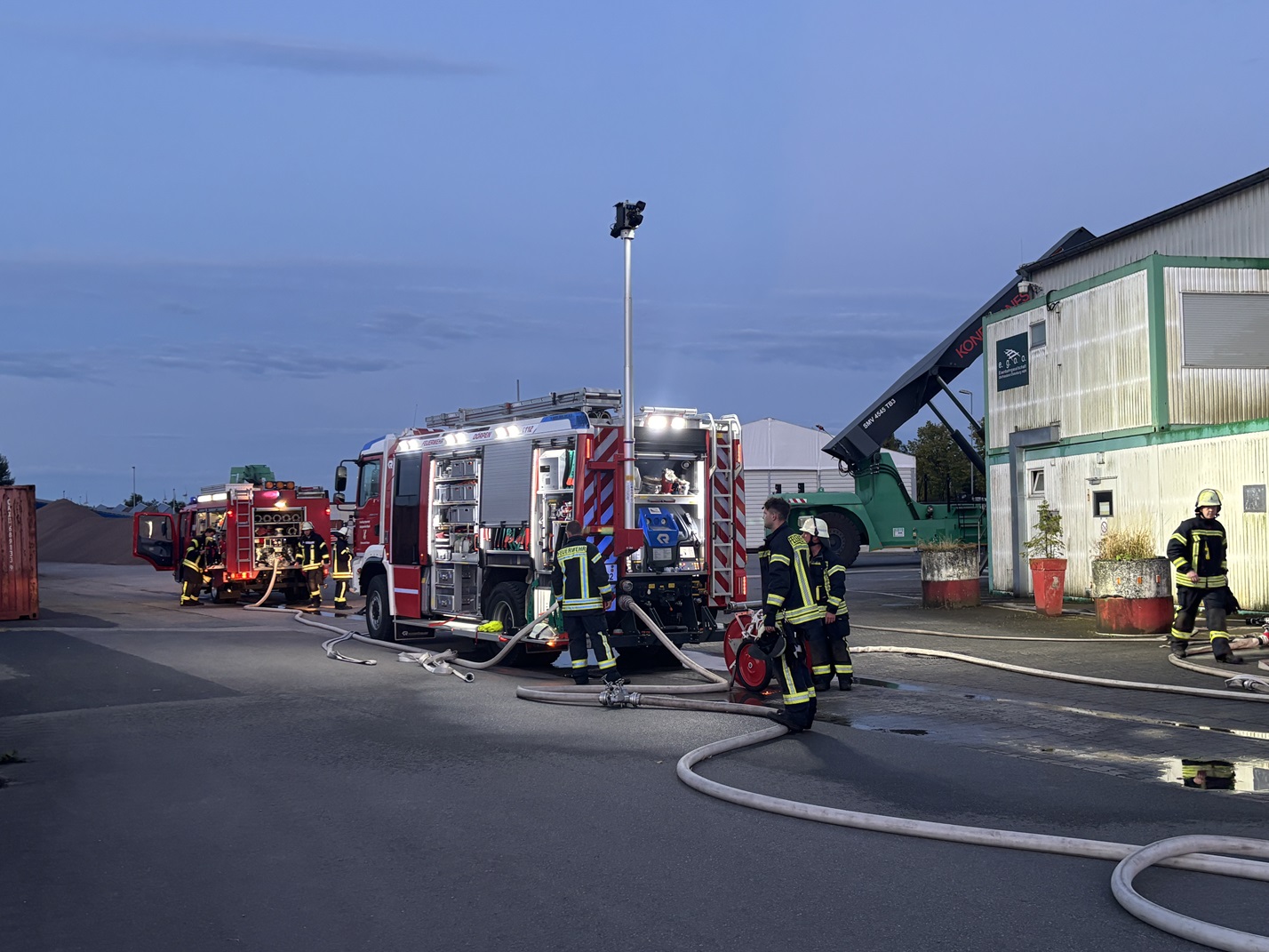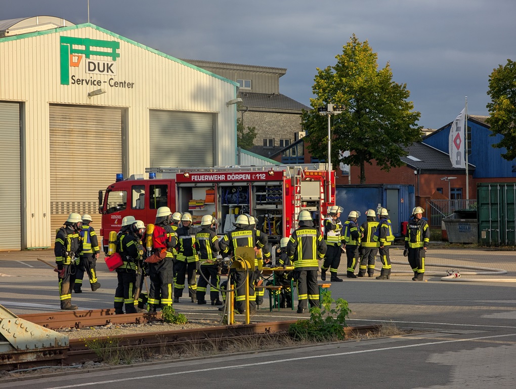 Gegen 18 Uhr wurde die Ortsfeuerwehr Dörpen zunächst mit dem Stichwort „F2_sonst – unklare Rauchentwicklung“ zur Firma Dörpener Umschlaggesellschaft für den kombinierten Verkehr mbH (DUK) alarmiert. Nach dem Eintreffen des Ortsbrandmeisters Ralf Sievers bestätigte sich schnell ein Brand mit Gefahrstoffaustritt, sodass die Alarmstufe auf „F3X_Gebäude“ erhöht werden musste.