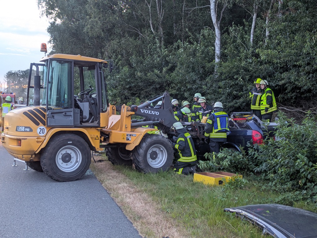 Währenddessen meldete die Leitstelle Ems-Vechte ein weiteres Szenario: Im Werksverkehr war ein Radlader seitlich mit einem Pkw kollidiert. Die Palettengabel des Radladers durchbohrte das Auto, in dem sich zwei Personen befanden. Beide wurden schwer eingeklemmt, der Fahrer des Radladers war ebenfalls verletzt und nicht ansprechbar.